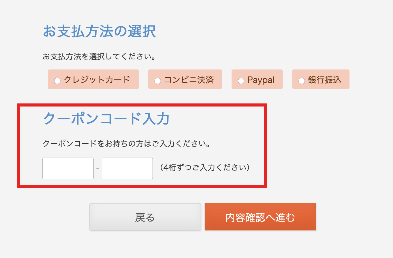 ③ 購入画面「お支払方法」のクーポンコードに入力して講座を購入!