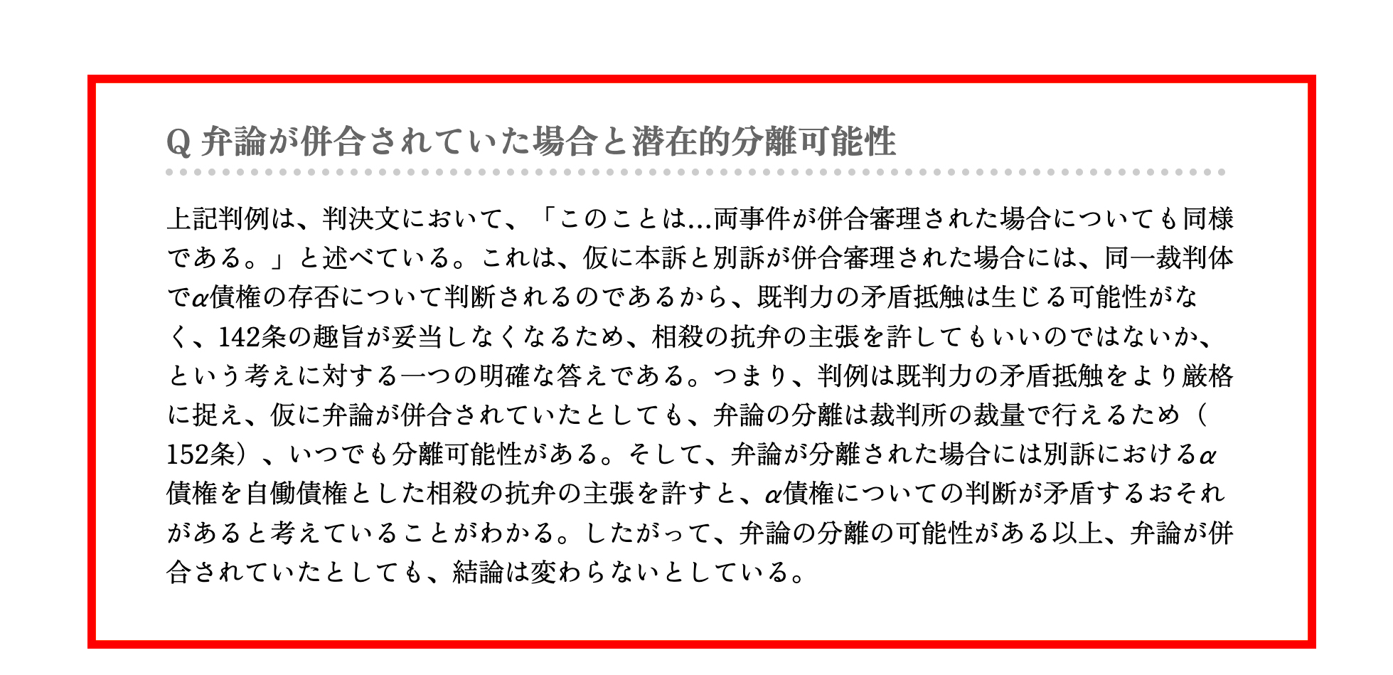 『これだけ!75』では、同判例がなぜ相殺の抗弁を適法としたのかについて、平成3年判決が述べた「潜在的分離可能性」とはどういった意味なのか、潜在的分離可能性を否定した令和2年判決はどういった点に着目して潜在的分離可能性を否定したのか等の思考の中身を予備試験合格者である剛力講師が丁寧に解説をしています。