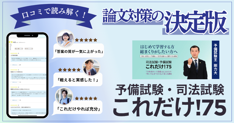 そのため、受験生としては「暗記だけ」で合格することはできません。「暗記」+「思考し、答案へ表現する力」が求められます。『これだけ!75』は予備試験合格者の「思考」と「答案への表現力」の双方を身につけることができる講義です。これだけ!75でCBTへの対策を誰よりも早く行いましょう!