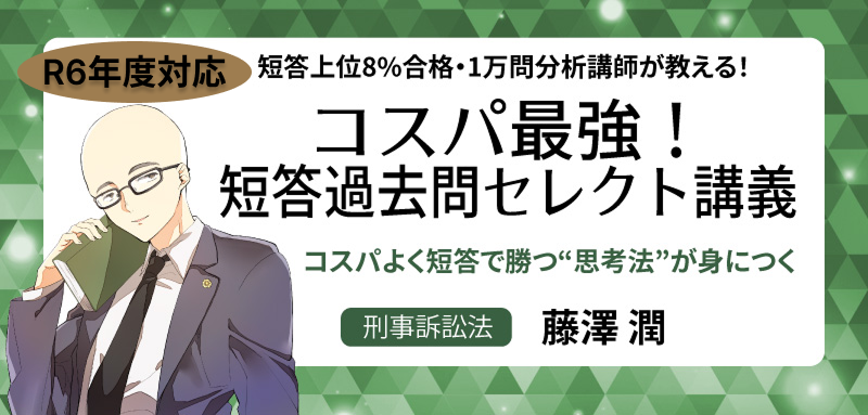刑事系短答上位3%の実績を持つ藤澤講師が、1万肢以上の分析から「合否を分ける問題」だけを厳選。単なる知識の暗記ではなく「なぜこの制度があるのか」という趣旨から解きほぐすことで、初見の問題にも対応できる「思考の枠組み」を伝授します。条文・判例・趣旨を線で繋ぐ解説に加え、実戦的な時間配分や見切り判断まで学べる、コスパ最強の短答対策講義です。
