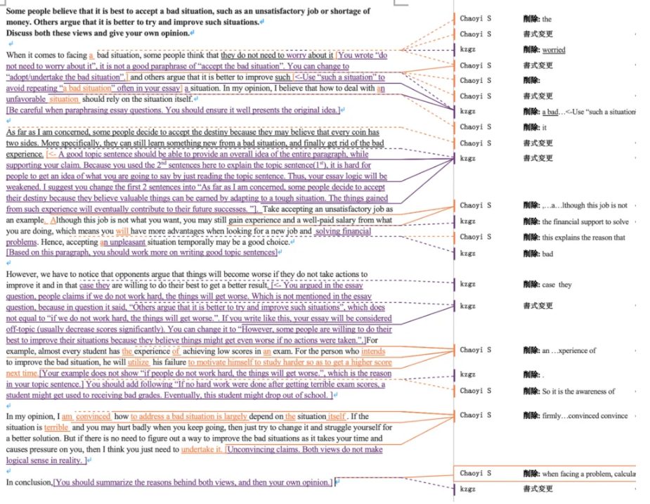 講義中は異なる問題タイプに対応する高得点テンプレに加え、表現の幅を広げるためのパラフレーズ、表現法、文法、語彙力を強化し、ハイスコアにつながるエッセイに仕上げる練習を重ねます。