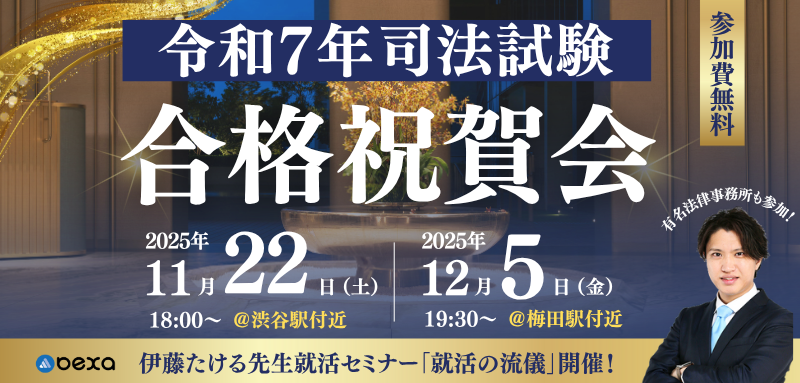 講師や他の合格者の方々と語り合い、喜びを分かち合うひとときとして、また今後の就職活動への情報収集の場としてぜひご参加ください。合格までの努力を称え合い、これからの法律家としての歩みに向けて新たなつながりを築く機会となれば幸いです。