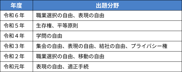 もちろん、表現の自由や職業選択の自由が最優先事項であることは変わりませんが、それ以外の権利が出題されたときの準備も必須といえるでしょう。
