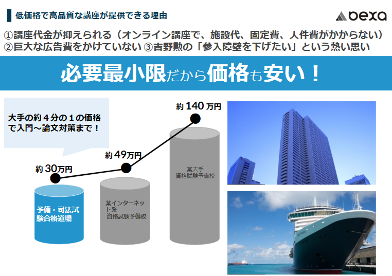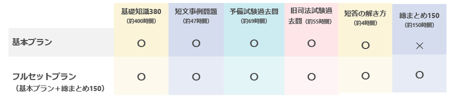 基礎知識380 約400時間/短文事例問題講座 約47時間/旧司法試験過去問講座 約55時間/予備試験過去問講座 69時間/短答の解き方講座 約4時間予定