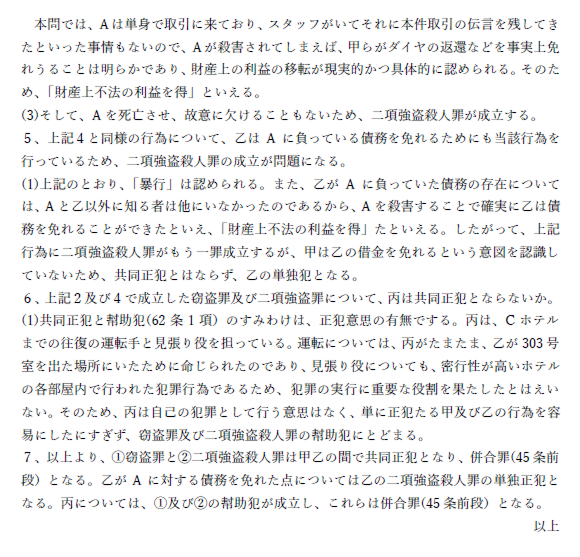 さらに、答案例がないため④あてはめのポイントにも重点は置かれていません。予備試験論文刑法では、法解釈以上にあてはめが重要視されるため、あてはめの相場観や考え方を重点的に学べないことは非常に痛いです。