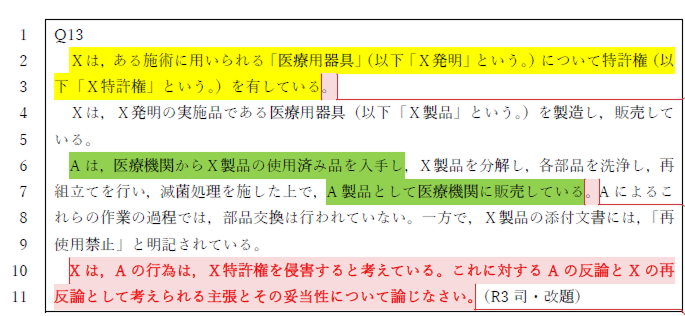 ■STEP1:権利者・発明のカテゴリーを特定。 問題文をみれば、Xが請求の主体であることがわかるので、Xが権利者であることを確認します。発明のカテゴリーも特定します。