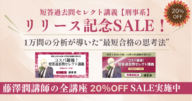 【刑事系短答上位3%講師・藤澤潤】短答過去問セレクト講義〈刑事系〉のリリースを記念して、藤澤講師の全講座を大特価SALEでご提供!