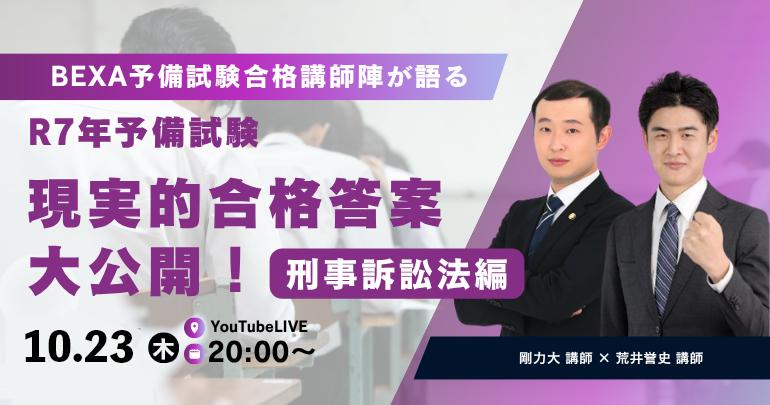 【2025/10/23(木)20:00~】BEXA予備試験合格講師陣が語る R7年予備試験 現実的合格答案大公開!【刑事訴訟法編】