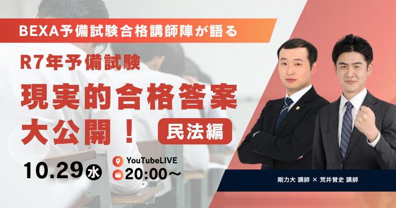 【2025/10/29(水)20:00~】BEXA予備試験合格講師陣が語る R7年予備試験 現実的合格答案大公開!【民法編】