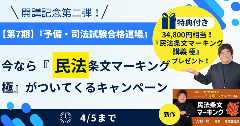 【第7期】『予備試験・司法試験合格道場』開講記念第2弾!今なら『民法条文マーキング極』がついてくるキャンペーン【4/6まで!】