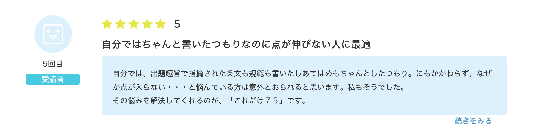 受講者は、この講座を通じて「迷いが消えた」「書けるようになった」「事実の評価(あてはめ)に必要な視点が分かった」などその効果を語ってくれました。今回は、受講生のリアルな口コミをもとに「これだけ!75」が選ばれている理由をご紹介します!