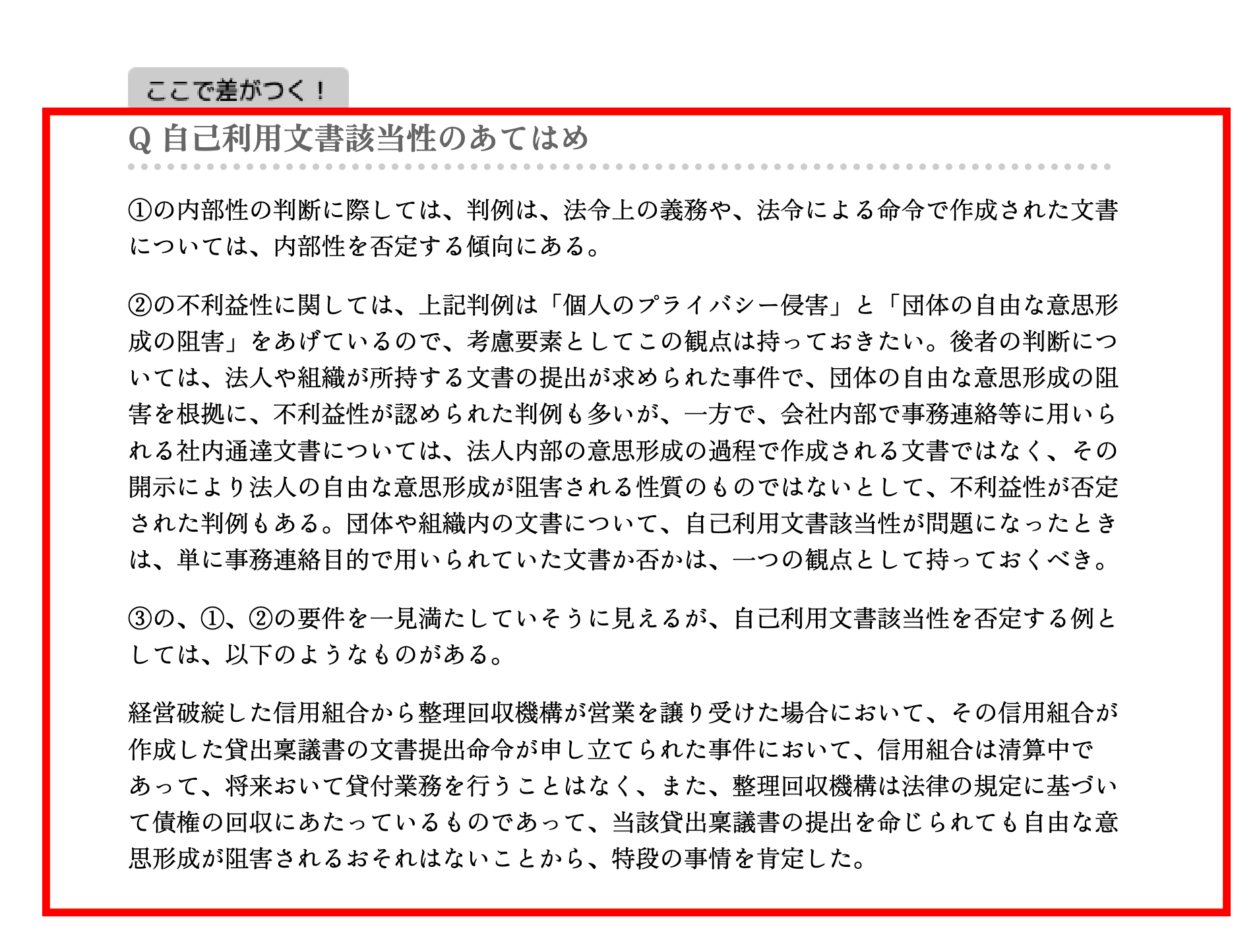 設問1では、220条4号ニの自己利用文書該当性について問われました。『これだけ!75』では、自己利用文書該当性について、単に判例が示した要件を解説するにとどまらず、あてはめの際の視点も、「ここで差がつく!」として解説しています。あてはめの際の視点まで含めて頭に入れておくことで、事案に対して「思考」ができるようになり、「思考を答案に示す」ことで「書き勝つ」合格答案を作成することができるようになるわけです。
