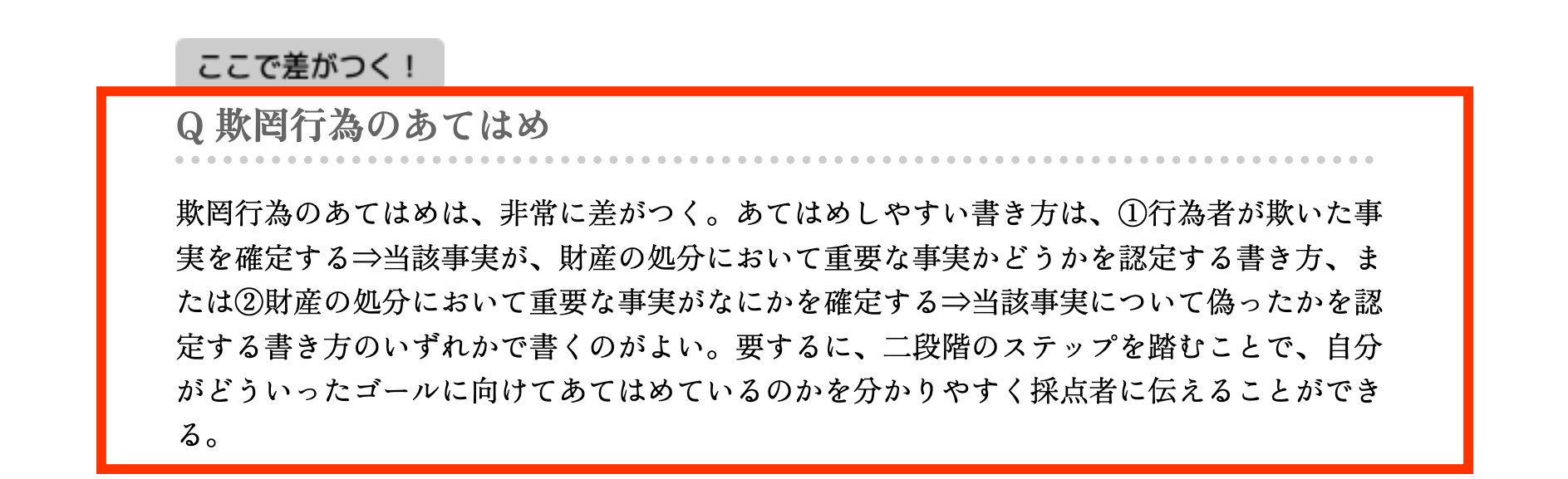 例えば、令和7年予備試験刑法設問1では、「横領罪」・「詐欺罪」と多くの受験生が知っている罪責の検討が求められました。そのため、合格のためには、「書き負けない答案」ではなく、「書き勝つ答案」が求められました。『これだけ!75』は、「ここで差がつく!」ポイントとして、詐欺罪における欺罔行為の認定の仕方、事実の使い方、思考の順番、二重譲渡事例における検討ポイントを解説しています。