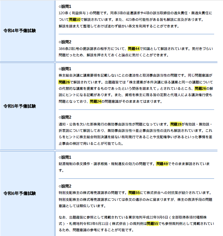 直近3年分の予備試験論文試験の出題範囲と『Law Practice商法』の解説の対応関係を簡単にまとめてみました。