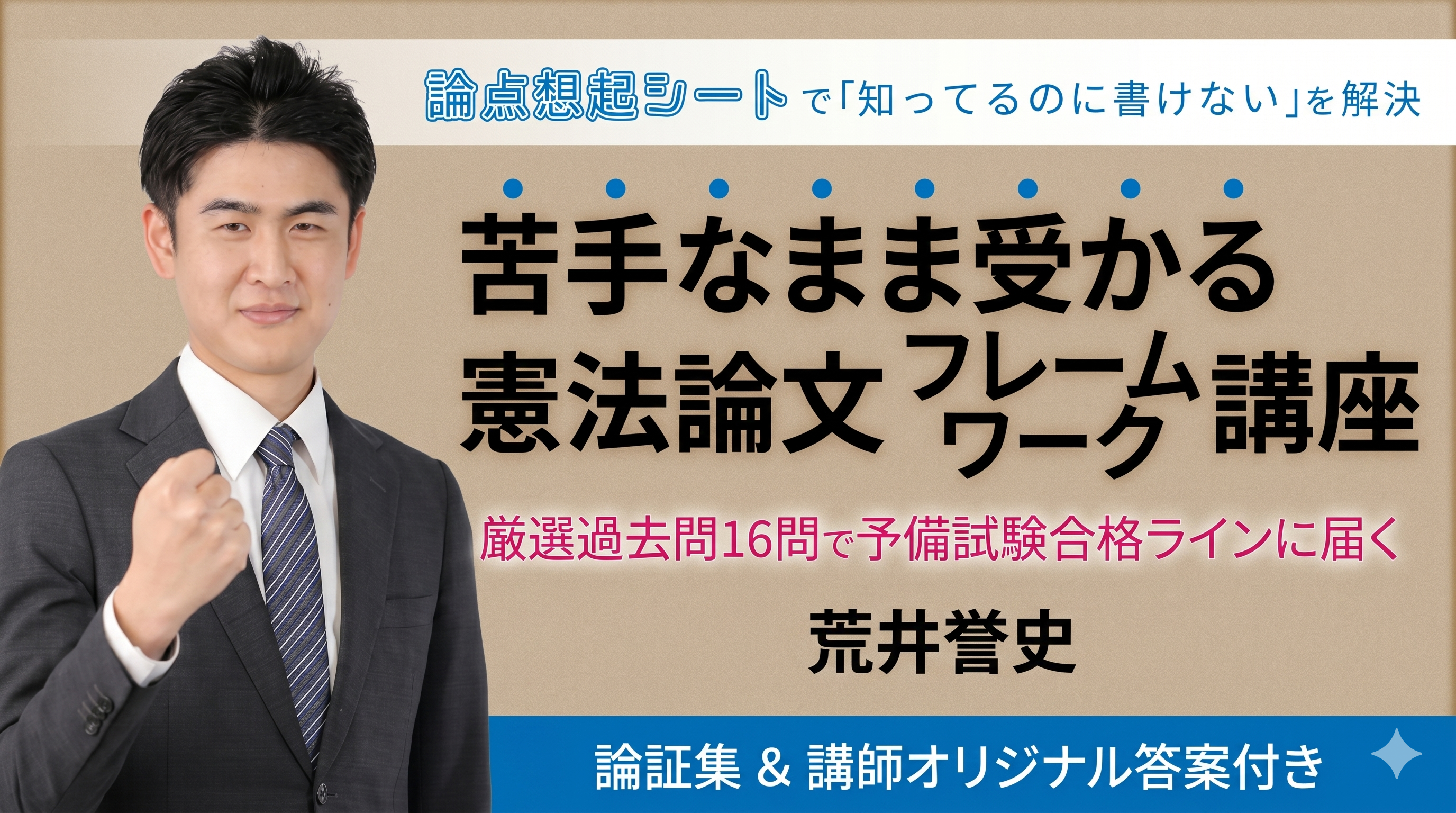 本講座では、この基本書を試験対策用の一元化教材として加工。予備試験合格者である荒井たかふみがナビゲートすることで、知識だけでなく、論文に必要な「法的思考プロセス」を最短距離で習得します。