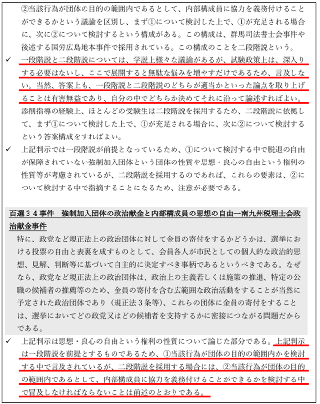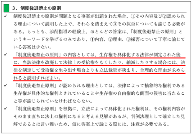 また、令和5年本試験論文で出題された生存権でも、堀木訴訟や老齢加算廃止事件といった百選掲載判例の解説にとどまらず、高得点を取るために不可欠である1項2項峻別論や制度後退禁止の原則といった学説上の議論についてもしっかりと補足しています。どういう判断枠組みで書けばいいのか、原告被告で何を主張すればよいのかの整理は勿論のこと、どうすれば短い時間で処理できるのか、どうすれば高得点が取れるのかという点まで完全にカバーしています。