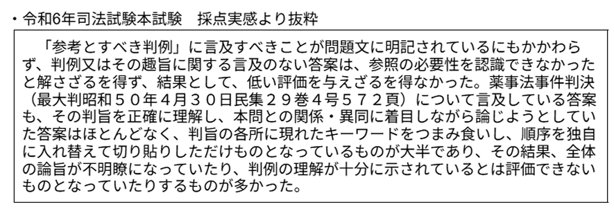 毎年試験後に公表される論文試験の採点実感や出題の趣旨(予備試験では出題の趣旨のみ)では、必ずと言っていいほど「判例の理解」「判例を踏まえた検討」を求める記載があります。